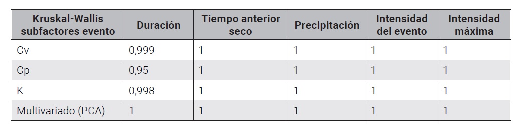 Para el factor “evento” se realizó el análisis de subfactores considerados de interés para el proyecto como la duración, el tiempo anterior seco, la precipitación, la intensidad total y la intensidad máxima, a los cuales se les aplicaron las pruebas no paramétricas, para sus resultados clasificados en tres grupos: alto, medio y bajo, divididos a partir de los cuartiles 1 y 3; es decir, que los resulta-dos para estos subfactores que se encuentran por encima del tercer cuartil (75 %) se consideran con clasificación “alto” y se les asigna un valor de 3. El segundo grupo comprende desde el primero hasta el tercer cuartil (inclusive), clasificado como “medio” y con la asignación del valor 2, y al grupo restante, debajo del primer cuartil, le corresponde el valor de uno y la clasificación de “bajo”. En la Tabla 5 se presentan los resultados de la prueba de Kruskal-Wallis para los subfactores del evento, en la que se muestra que todos los subfactores aportan significativa-mente en la respuesta de los indicadores del comportamiento hidrológico.