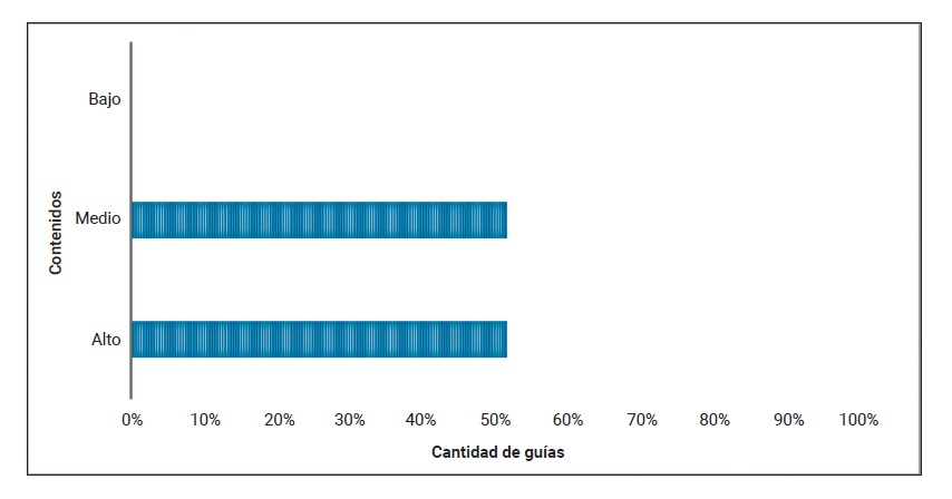 Como se observa en la Fig. 3, el nivel del contenido de los materiales ofrecidos por las guías es medio o alto, lo cual indica que la forma como las guías exponen sus contenidos es de fácil comprensión para los desarrolladores o personas que la vayan a utilizar.