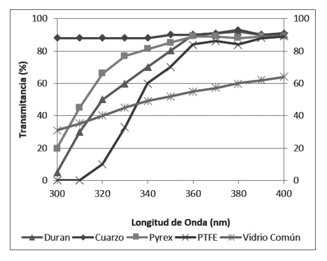 La óptica se manejó a partir de la implementación de vidrio tipo Pyrex, con buenas garantías de transmitancia (Fig. 3) e importante captura de rayos UV; así, se mantuvieron las necesidades para la reacción fotocatalítica para radiación cuya longitud de onda sea menor a 400 nm [3], [4].