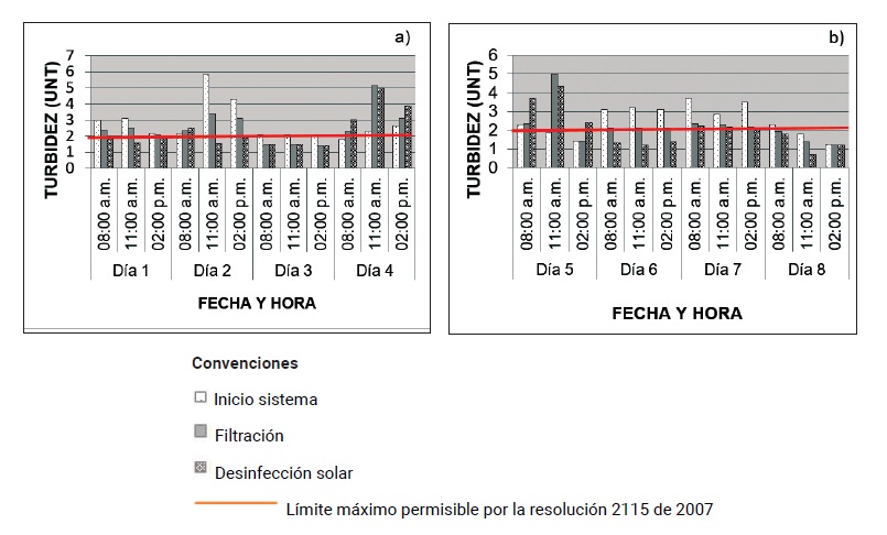 El comportamiento presentado durante los días seleccionados con carga hidráulica de 63,36 m3 m-2 dia-1 corresponde a un decrecimiento con valores de turbiedad del 24 %, 30 % y 70 % en días cuando las condiciones meteorológicas favorecieron el almacena-miento de agua pluvial por presencia de precipitaciones. No obstante, en días cuando la precipitación fue escasa, el lecho filtrante se saturó y generó arrastre de material y de esta manera aumentó la turbiedad, debido a que hubo bajos volúmenes de agua para operar el sistema, hecho que implicó la intermitencia en el paso del fluido. La Fig. 5 a) muestra que la oferta de lluvia es directamente proporcional a la reducción de la turbiedad. Esta influencia se ve reflejada en el cumplimiento o no del umbral definido por la norma para el parámetro (resolución 2115 de 2007; valor máximo permitido para turbiedad 2 UNT).