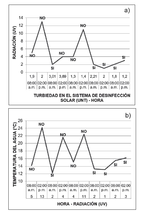 La Fig. 6 a) muestra los valores del índice de radiación y de turbiedad con respecto a la desinfección. Los datos de radiación por de-bajo de 3UV indican en todos los casos presencia de coliformes, con turbiedad entre un rango de 1,2 a 3,0 UNT. Sin embargo, el valor de turbiedad más alto registrado en la desinfección fue de 4 UNT, en presencia de un índice de radiación de 4 UV con eliminación de coliformes. En síntesis, para obtener 100 % de eliminación de microorganismos, debe existir un índice de radiación mayor a 4 UV y turbiedad menor o igual a 4 UNT. Con lo anterior, se muestra que la mayor influencia en la desinfección por fotocatálisis heterogénea se debe a la radiación, desde que se cuente con valores de turbiedad por debajo de 4 UNT.