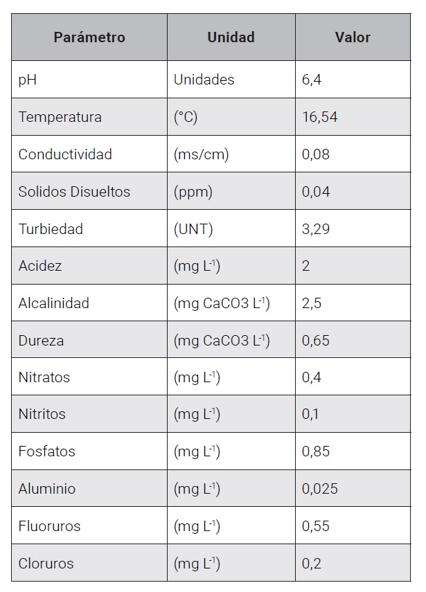 También se valoraron, como se muestra en la Tabla 1, los parámetros acidez, alcalinidad, dureza, aluminio, hierro, nitritos, nitratos, fosfatos, fluoruros y solidos suspendidos totales; a partir de muestreos puntuales, en respuesta a la resolución 2115 de 2007,1 y condiciones idóneas de preservación, custodia y transporte de muestras.