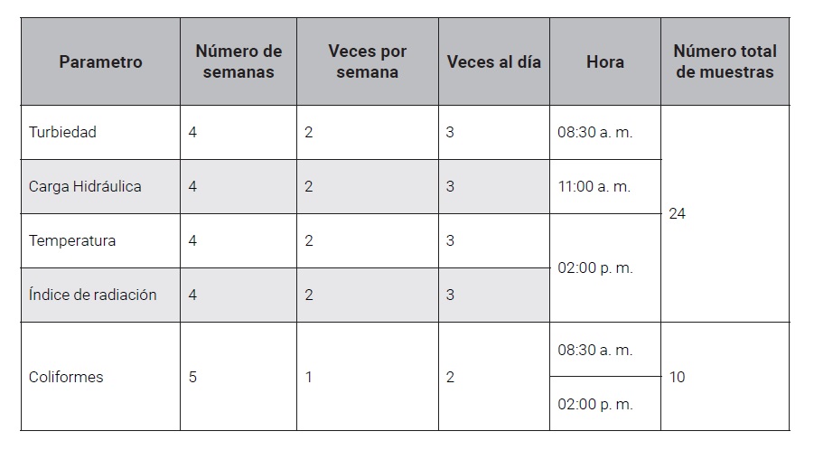 Las principales variables que influyen en la desinfección se presentan en la Tabla 2. De acuerdo con estas, se estableció el número de muestreos y de muestras por realizar.