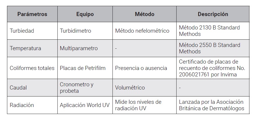 Las mediciones in situ fueron realizadas para obtener estados del tiempo aleatorios y estudiar la incidencia en la desinfección de acuerdo con el comportamiento de las variables mencionadas. Se verificó el cumplimiento de la resolución 2115 de 2007 de los parámetros señalados en el numeral 1.1. En la Tabla 3 se presentan las mediciones realizadas y los métodos empleados.