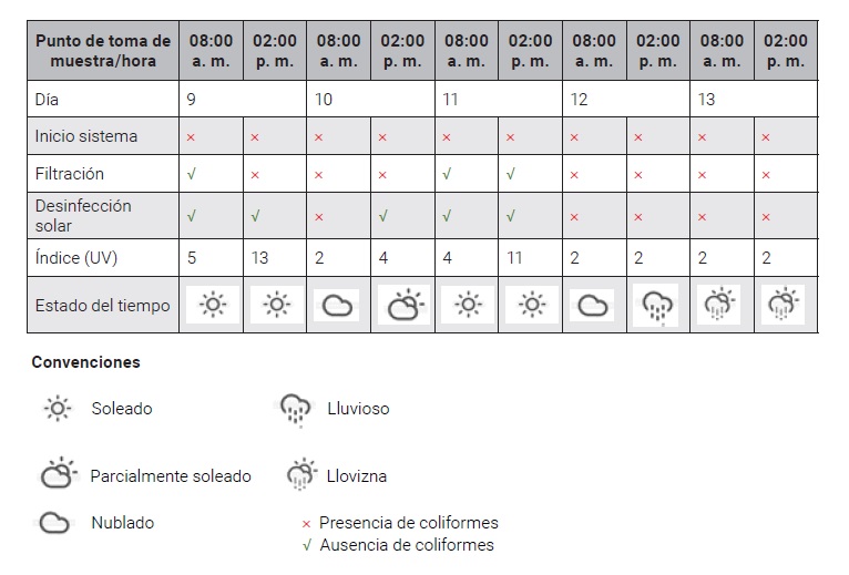 La Tabla 5 relaciona la presencia o ausencia de coliformes con respecto al índice de radiación y el estado del tiempo al momento del muestreo. Los días que presentaron precipitaciones tuvieron menor incidencia de la radiación y mostraron presencia de coliformes. Bajo entornos nubosos también se observa ausencia de desinfección. Sin embargo, condiciones soleadas y parcialmente soleadas son favorables para la eliminación de microorganismos, con índices de radiación UV entre 4 y 13 o longitudes de onda entre los 280 y 400 nm. No obstante, el estudio de DMA Alrousen presenta la evaluación de un sistema de fotocatálisis heterogénea con TiO2 recubierto en los tubos en donde se evidenció desinfección en condiciones de nubosidad [30].