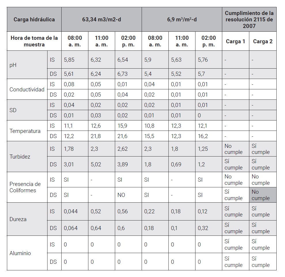 La evaluación de los parámetros se hizo con dos cargas hidráulicas diferentes: 63,36 y 6,9m3/m2-d. Los datos de la carga hidráulica 63,36 m3/m2-dia mostraron que el 70 % de los parámetros medidos cumplió con los va-lores máximos permisibles, según la resolución 2115 del 2007, mientras que con 6,9m3/ m2-d, se observa que el 100 % de los parámetros cumple (ver Tabla 6).
