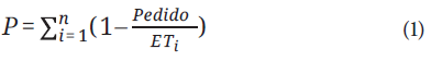 Con el fin de comparar el modelo actual de manufactura de la empresa tipo combinación pull/push con el propuesto tipo pull, se propone una medida que se denominará penalización denotada por P. La penalización P se ha definido mediante la ecuación (1), en la que el cociente entre el pedido y el estándar ETi da cuenta de la utilización del material. El subíndice i se refiere a la subparte i, mientras que ETi es el estándar de la subparte i. La penalización será grande si hay muchos desajustes entre el pedido y los estándares.