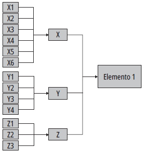 La empresa fabrica, entre otros, partes de un producto denominado elemento 1 que se entregan al cliente quien debe ensamblar el producto. Para fabricar un elemento 1, se necesitan tres partes que se producen de manera independiente: la parte X, la parte Y y la parte Z. A su vez, cada parte está formada por subpartes, por ejemplo, para la parte X, son necesarias 6 subpartes (X1, X2,..., X6), para la parte Y cuatro subpartes (Y1,..., Y4) y para la parte Z tres subpartes (Z1,.., Z3). En la figura 1, se muestra el diagrama de flujo del proceso para el elemento 1, que es en paralelo.