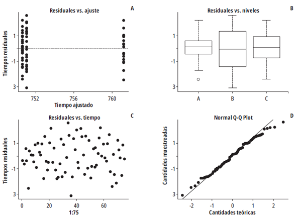 Con el fin de darle soporte a la prueba ANOVA en el punto anterior, se realizó la verificación de supuestos, para tal efecto se presenta la figura 3. En la parte superior izquierda, se verifica que los residuales tienen media 0 y están homogéneamente distribuidos; en la parte superior derecha, se puede verificar la homogeneidad de las varianzas y que los residuales se mueven alrededor de 0; en la parte inferior izquierda, los residuales no muestran ningún patrón, lo que indica independencia de los errores, de modo que esto es positivo para el análisis; por último, en la parte inferior derecha, se detecta que los residuales siguen una distribución normal con media 0.