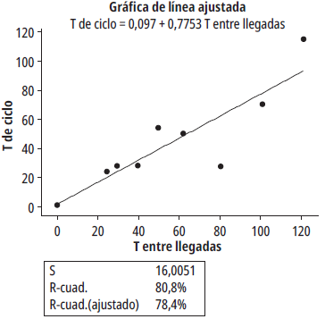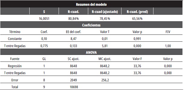 En la tabla 6, se muestra una salida de la regresión, construida en el software Minitab 18, para tener un análisis más analítico y no solo gráfico del modelo de regresión. El resultado sugiere que hay una relación directa entre tiempos de ciclo y tiempos entre llegadas, en que la constante no es significativa, pero sí lo es la pendiente. Los errores, según el ANOVA, son pequeños comparados con el modelo de regresión, así que el modelo explica la mayor variabilidad y no tanto los errores. También en la figura 4 se detecta un coeficiente de regresión de 0,8084, lo que indica una buena relación lineal entre las dos variables.