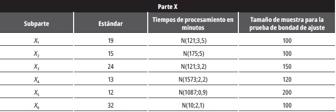 Después se realizaron las medidas de los tiempos necesarios para la producción de las distintas subpartes en cada estación de trabajo, que se denominarán tiempos de procesamiento. Estos tiempos se tomaron varias veces, y se realizaron análisis de las distribuciones con el fin de obtener las medias y desviaciones de tales medidas, que siguieron una distribución normal. Estos tiempos de procesamiento son insumos indispensables para la simulación de los procesos. En la tabla 1, se presentan los tiempos determinados para la fabricación de cada subparte que conforma la parte X, los que se expresan en términos de la media y de la desviación estándar.