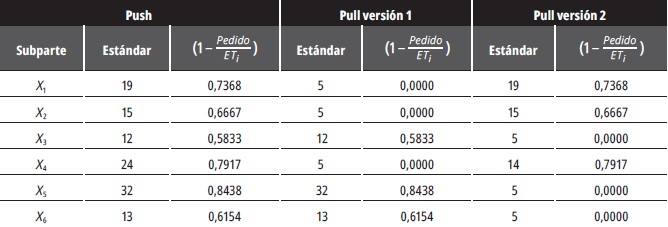 Considerando que la fabricación del elemento 1 necesita una parte X y que a su vez dicha parte necesita la fabricación de subpartes, se aplicó la ecuación (1) para las siguientes dos situaciones: la primera, para una versión actual de fabricación de la parte X tipo push, y la segunda, para la fabricación de la misma parte en dos posibles versiones tipo pull que consideran subcontrataciones. El análisis se ha realizado para un pedido de 5 elementos 1. Se pueden observar en la tabla 2 los estándares actuales que la empresa usa para producir subpartes de la parte X. Para aclarar esta idea, obsérvese que para producir una sola parte X hay que comprar un material principal del que salen 19 subpartes X1 y otro material del que producen 15 subpartes X2, y así sucesivamente. Las compras mencionadas parten del supuesto de que no hay inventarios de las subpartes X1 y X2. Se ha considerado, en la versión 1 pull, la situación en que sea posible subcontratar la fabricación de las subpartes X1, X2 y X4; por ello, en la tabla 2, los estándares correspondientes son 5, lo que quiere decir que para un pedido de 5 elementos 1 que necesitan de 5 partes X se tendría que subcontratar la fabricación de 5 subpartes X1, 5 de X2 y 5 de X4. Como se está subcontratando, la contribución de estos materiales a la penalización es 0, por lo que el estándar tiene que ser 5, ya que se adapta al pedido de 5 elementos 1. Nótese que se tuvo una penalización de la versión pull 1 de 2,0425, menor que la versión push actual. En la versión pull 2, se ha considerado la alternativa de subcontratar la fabricación de las subpartes X3, X5 y X6 tras lo cual se obtuvo una penalización de 2,1952. La primera versión ocasiona menos penalización que otras consideradas.