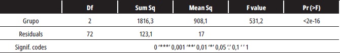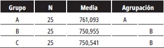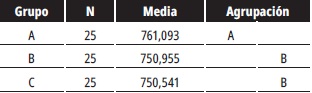 Como en la figura 2 se observan diferencias entre el tratamiento A comparado con los tratamientos B y C, se ha realizado un análisis pos-ANOVA que permita, de manera analítica, rectificar tales diferencias. Las tablas 4 y 5 muestran comparaciones Tukey y Fisher, respectivamente, pruebas que se consiguieron a través del software Minitab versión 18.
