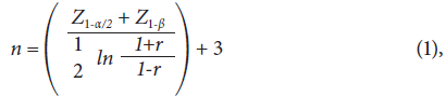 Se utilizó un coeficiente de correlación de Pearson r igual a 0,60 (i. e., se espera al menos una correlación de 0,60), y una seguridad y poder estadístico del 95%. Para estas condiciones, los valores de Z1-α/2, Z1-β son 1,96 y 1,645, respectivamente, y el número mínimo requerido de muestras es de 30 (ecuación (1)). Se asumió un bajo coeficiente r, debido a que este es inversamente proporcional al número requerido de muestras, i. e., si se obtiene una correlación mayor, como se espera en este estudio, se necesitaría menor número de muestras para tener un análisis estadístico confiable.