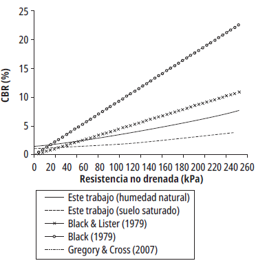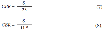 Posteriormente, [19] en 1979 investigaron la resistencia de subrasantes de arcilla y su relación con la humedad, plasticidad y CBR. Para arcillas remoldeadas, a partir de modelos de estudios de zapatas realizados por [30] en 1951, se encontró que el esfuerzo requerido para penetrar el pistón CBR era igual a la mitad de la capacidad portante última del suelo, y propusieron la ecuación (7) para obtener el CBR en función de la resistencia no drenada. En el mismo año, [20], a partir del estudio de la resistencia de arcillas inalteradas usando un penetrómetro, sugirió que el esfuerzo requerido para penetrar el pistón CBR era igual a la capacidad última del suelo, y propuso la ecuación(8) para calcular el CBR de muestras inalteradas de arcillas sobreconsolidadas. Recientemente, en 2007, [12] también sugirieron que el CBR es igual a la capacidad portante última del suelo; no obstante, se verificó su aplicabilidad para muestras reconstituidas, y no para muestras inalteradas, como lo propuso [20].