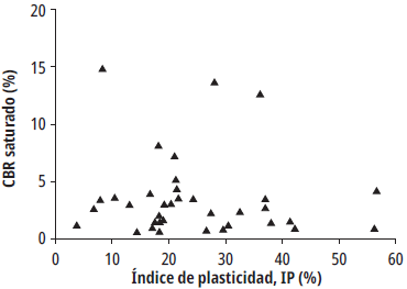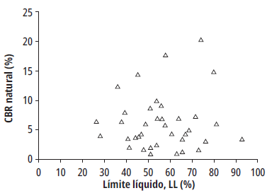 A pesar de que se intentó correlacionar el CBR, tanto en estado natural como saturado, con propiedades índice como los límites de Atterberg, humedad natural y contenido de finos, la tendencia entre las variables no fue tan buena como en la resistencia a compresión inconfinada, ni de forma individual ni para combinaciones entre ellas.