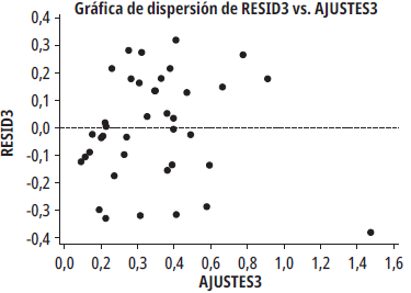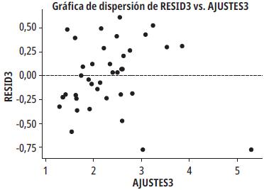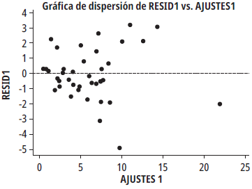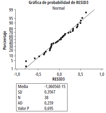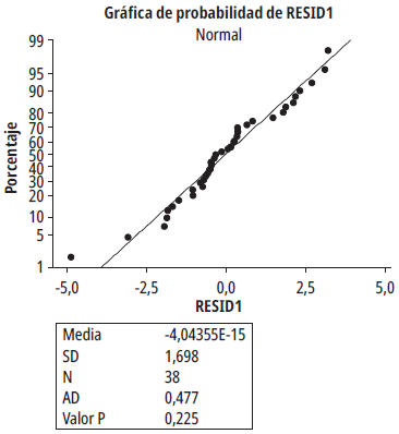 Para verificar la distribución normal de los residuos, se compara el valor P de la gráfica de probabilidad normal de residuos con un nivel de significancia especificado, a (usualmente 0,1, 0,05, 0,01), que define la probabilidad de rechazar la hipótesis nula cuando esta es cierta. Para fines prácticos en análisis estadístico, suele tomarse un nivel de significancia a = 0,05, i. e., el 5% de probabilidad de error. Más información sobre el valor a y su selección puede encontrarse en [21,29]. Si el valor de P, que mide la fuerza de la evidencia para descartar la hipótesis nula, es igual o menor que el valor de significancia, se rechaza la hipótesis nula y se concluye que los datos no siguen una distribución normal. Si, por el contrario, el valor de P es mayor que el nivel de significancia, no se puede rechazar la hipótesis nula, puesto que no hay evidencia suficiente para concluir que los datos no siguen una distribución normal [21]. En este caso, la hipótesis nula es verdadera y se considera que los residuos siguen una distribución normal. La distribución normal de los residuos también puede evaluarse gráficamente, a partir de la gráfica de probabilidad normal de residuos. Si la distribución es normal, dicha gráfica debe seguir una tendencia lineal. Para comprobar que no hay datos asimétricos o que se incluyan valores atípicos, se utiliza el histograma de residuos. La asimetría se refleja mediante largas colas en dirección, y los valores atípicos se presentan cuando hay algunas barras muy alejadas de las otras [21]. Ambas condiciones son indeseables en la regresión. En cuanto a la varianza constante para los residuos, se verifica a partir de la gráfica de dispersión de residuos versus ajustes. En dicha gráfica, los puntos deben ubicarse aleatoriamente a ambos lados de la escala horizontal, con patrones no detectables en los puntos [21]. Si los tres supuestos descritos se pueden satisfacer, la correlación es confiable y se puede proponer una ecuación entre las variables correlacionadas.