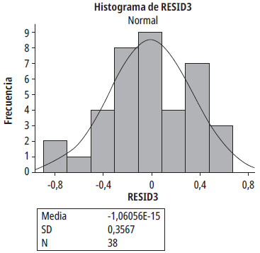 Se plantea la ecuación (5) para la transformación, y las gráficas de probabilidad normal de residuos, histograma de residuos y dispersión de residuos versus ajustes se ilustran en las figuras 13, 14 y 15, respectivamente.