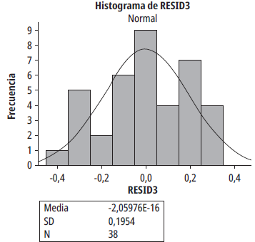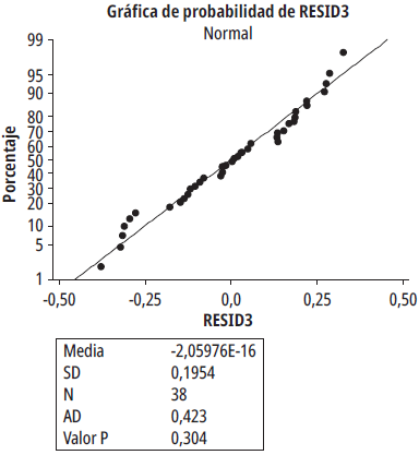 Se plantea la ecuación (2) para el análisis estadístico, y las figuras 7, 8 y 9 muestran las gráficas de probabilidad normal, el histograma de residuos y la dispersión de residuos versus ajustes, respectivamente.