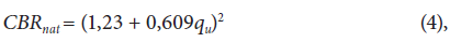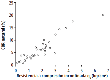 donde CBRnat es el CBR (%) bajo condiciones de humedad natural y qu es la resistencia a la compresión inconfinada (kg/cm2).