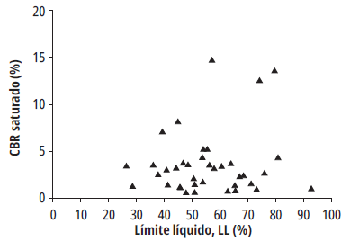 Las figuras 4, 5 y 6 muestran gráficas de dispersión de CBR saturado con el límite líquido, el índice de plasticidad y la resistencia a la compresión inconfinada, respectivamente. Al igual que para el CBR en estado natural, en las figuras 4 y 5 (límite líquido e índice de plasticidad) se aprecia que la nube de puntos es muy dispersa y no hay una tendencia definida. Debido a lo anterior, se puede establecer que el CBR en estado saturado no presenta relación con el límite líquido y el índice de plasticidad. En la figura 6, que ilustra el CBR saturado versus la resistencia a la compresión inconfinada, se puede ver que la nube de puntos sufre una leve dispersión si se compara con la misma gráfica para el CBR natural (figura 3), pero sigue cierta tendencia y puede ser analizada estadísticamente para encontrar alguna relación entre estos dos parámetros.