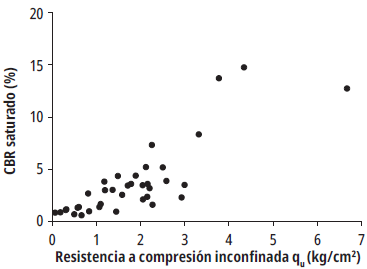 Existen en la literatura pocas referencias sobre correlaciones del CBR con la resistencia al esfuerzo cortante, en especial para suelos de grano fino. A través de una amplia revisión de literatura realizada antes de preparar este artículo, no se encontraron correlaciones entre el CBR de laboratorio de muestras de suelo fino inalteradas y la resistencia a la compresión inconfinada. Se encontró alguna información con ensayos de resistencia al corte, en especial triaxiales tipo no consolidado no drenado (UU, por sus siglas en inglés), realizados sobre muestras reconstituidas de suelos granulares o mezclas de suelos granulares y suelos finos [12,19]. También se halló una correlación del CBR sobre muestras inalteradas de grano fino y su resistencia al corte determinada mediante penetrómetro de bolsillo, con lo cual los resultados de resistencia al corte pueden presentar grandes variaciones [20].