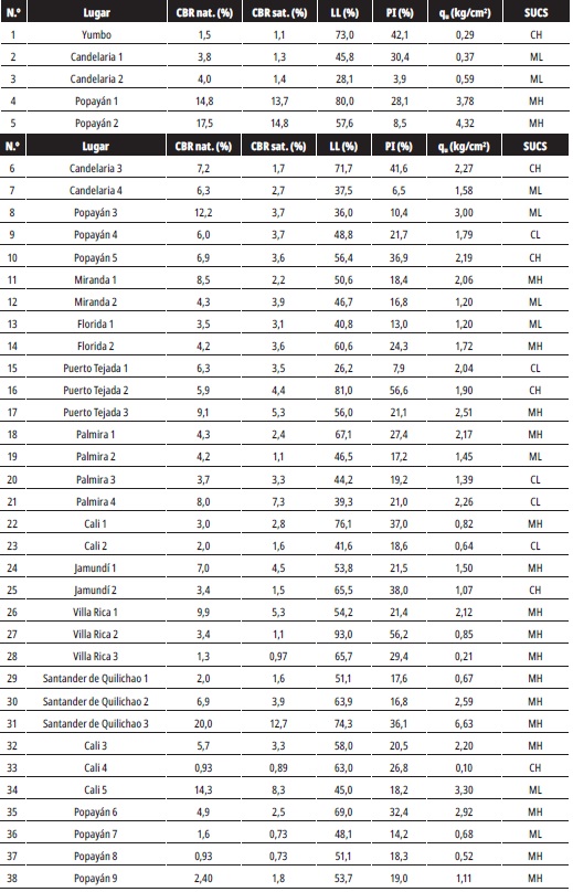A pesar de que existe en la literatura un número importante de correlaciones para obtener el CBR en función de las propiedades índice del suelo (e. g., [16,17]), ese no es el caso de la resistencia al esfuerzo cortante de muestras inalteradas de suelos finos, mediante el ensayo de compresión inconfinada. La poca información en la literatura corresponde a ensayos triaxiales no consolidados no drenados (UU) sobre muestras mezcladas con granulares o a ensayos sobre suelos finos con penetrómetro de bolsillo [12,18-20]. Por otra parte, las correlaciones encontradas [12,16-20] son presentadas sin realizar un previo análisis estadístico y en algunos casos se reportan pocos ensayos con gran variabilidad en los resultados.