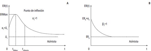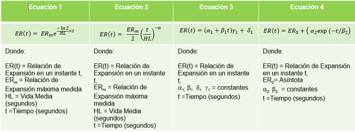 La representación gráfica de la variación de la ER en el tiempo se conoce como la curva de colapso o curva de decaimiento (DC, por sus siglas en inglés) de la espuma. Diferentes modelos de comportamiento de las espumas de asfalto con el tiempo se encuentran en la literatura técnica: algunos de los modelos propuestos siguen una función exponencial (ecuación (1)), similar a la presentada por el decaimiento de isótopos [3]; otros se aproximan a una función de tipo potencial (ecuación (2)), en particular para aquellos asfaltos que presentan ER superiores a 15 [10]; y otros modelos más refinados, obtenidos mediante análisis de regresión no lineales, se ajustan a funciones potenciales de 4 parámetros (ecuación (3)) o exponenciales de tres parámetros (ecuación (4)), dependiendo del tipo de asfalto, tal y como se indica en la tabla 1 y en las figuras 1a y 1b [11].