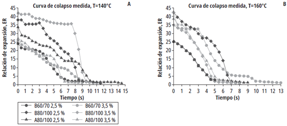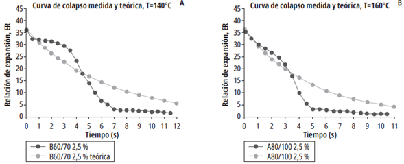 Las curvas de colapso obtenidas con el AFCT se apartan del modelo de comportamiento de tipo exponencial propuesto por [3], como puede apreciarse en la figura 10. En general, las expansiones medidas son superiores a la definida por el modelo para tiempos inferiores a la HL, invirtiéndose el comportamiento una vez superado este instante. Por otro lado, para varios de los asfaltos analizados, en especial para la temperatura de 140°C, se obtienen espumas que presentan curvas de colapso escalonadas, con una expansión que se mantiene relativamente constante en un intervalo de tiempo, como también se muestra en la figura 10.