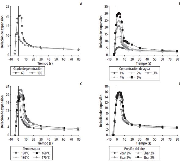 En la figura 2, se presentan varias curvas de colapso en que se puede apreciar el efecto que factores como el tipo de asfalto, la temperatura, la concentración de agua (FWC, por sus siglas en inglés) y la presión de aire tienen sobre su forma y, por supuesto, sobre las características y la calidad de la espuma [11]. Como se puede ver en esta figura, el tipo de asfalto y la FWC son los factores que tienen mayor influencia.