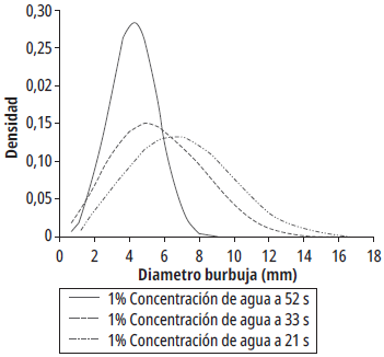 Las conclusiones de algunos estudios muestran que a mayor temperatura aumenta el tamaño de las burbujas y que la morfología de su formación depende más del tipo de cemento asfáltico que de la temperatura [17-18], que a bajas FWC se obtienen burbujas de menor diámetro [19] y que una porción significativa de las burbujas que contribuyen a la expansión del asfalto tienen diámetros aproximados del orden de 1 mm [20]. En la figura 3, se muestra una manera de representación de las curvas de distribución de tamaño de burbujas.