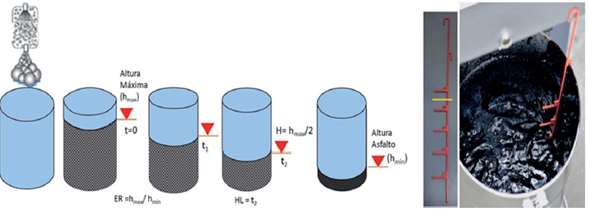 En la caracterización de las espumas de asfalto para su aplicación en la estabilización de suelos o en el reciclaje de pavimentos, se emplea tradicionalmente la técnica de la varilla graduada para medir los dos parámetros básicos que definen su calidad: la relación de expansión máxima (ERmáx, por sus siglas en inglés) y la vida media (HL, por sus siglas en inglés). La ER , se define como la relación entre el volumen máximo alcanzado por la espuma y el volumen ocupado por la misma masa de asfalto sin agua o espuma en él, mientras que la HL corresponde al tiempo -medido en segundos- que tarda la espuma en colapsar desde su máximo volumen hasta la mitad de este.