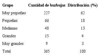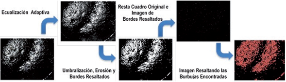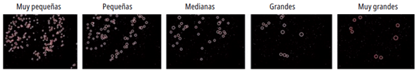 En la figura 7, se presentan los pasos para el procesamiento de la imagen de la parte central del recipiente que contiene la espuma, en un instante cercano al momento en el que se alcanza la expansión máxima, y en la figura 8 se puede ver el resultado del análisis de acuerdo con la clasificación de tamaños de burbuja establecida, a partir de la que es posible obtener los resultados que se presentan en la tabla 4.