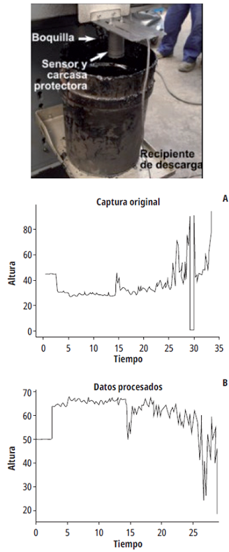 Para la obtención de la DC mediante una técnica no invasiva, se utilizó un sensor infrarrojo ubicado directamente bajo la boquilla de espumado que se encuentra en la planta WLB-10S. El sistema consta, básicamente, de un computador de placa reducida (Raspberry Pi) y un sensor infrarrojo con un rango de 15 a 100 cm, que apunta a una sección del recipiente donde se realiza la descarga de la espuma (figura 9). Este sistema a su vez está subdividido en un sistema de calibración, uno de registro de valores y uno de procesamiento y presentación de resultados.