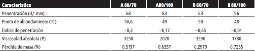 En este estudio, se evaluaron las características de espumado de cuatro cementos asfálticos clasificados por grado de penetración 60/70 y 80/100, procedentes de Apiay (A) y de Barrancabermeja (B). Las características generales de los cementos asfálticos se resumen en la tabla 2.