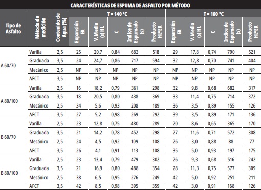 Aun cuando el objetivo principal del estudio no es evaluar la calidad de las espumas de asfalto usadas para probar las diferentes técnicas, los resultados confirman la influencia que tienen el tipo de asfalto, la FWC y la temperatura en la calidad de las espumas.