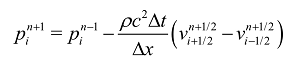 Reemplazando estas discretizaciones en el sistema (1) - (2), obtenemos las ecuaciones acústicas en el dominio discreto espacio-temporal: