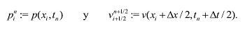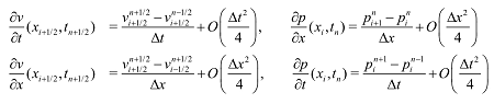Sobre esta malla calculamos los valores de presión en los puntos ( x i, t n) y los valores de la velocidad en puntos ( x i + Δ x / 2, t n + Δ t / 2). Como resultado, los valores discretos de la presión P y la velocidad v se localizan en dos mallas separadas. Así, denotamos con