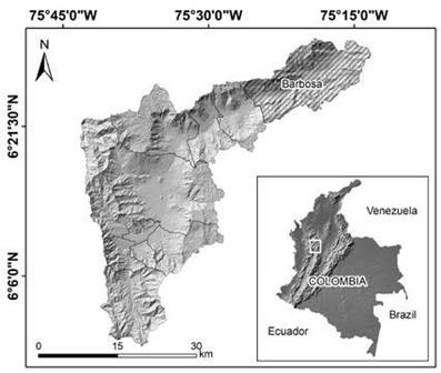 El municipio de Barbosa se localiza en el denominado Valle de Aburrá, al noroccidente de los Andes Colombianos [Figura 1]. Este territorio se encuentra en una región sísmica activa caracterizada como amenaza media por la Norma Sismorresistente (NSR-10) [45]. Estas condiciones de amenaza se suman a los altos niveles de exposición por la acelerada y poco planificada ocupación de las laderas [46], donde adicionalmente se presentan efectos de sitio y amplificación, debido a las características geotécnicas y geométricas de los suelos, conformados por espesos perfiles de meteorización y extensos depósitos de vertiente [45]. Por consiguiente, la evaluación de los efectos sísmicos en la estabilidad de las laderas ubicadas en el municipio de Barbosa es fundamental para la ordenación de su territorio debido a las condiciones susceptibles a este tipo de evento.