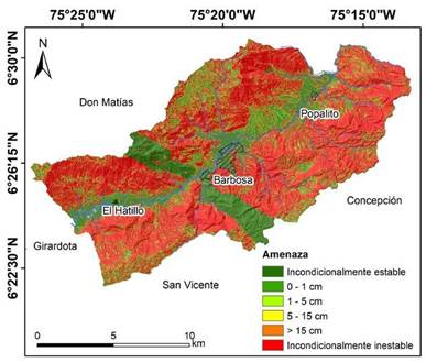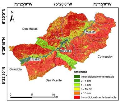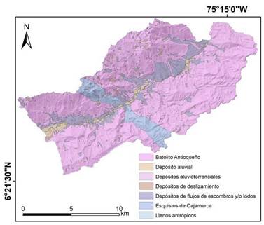 Para la parametrización de las propiedades geomecánicas de los suelos que conforman el área rural del municipio de Barbosa (Tabla 4), se utilizó la zonificación geotécnica elaborada en los estudios de microzonificación sísmica a partir del mapa geológico del municipio a escala 1:10.000 (ver Figura 2), donde se realizaron perforaciones y ensayos de laboratorio con correlaciones de ensayos de penetración estándar [7], [18]. Para la pendiente, en las zonas rurales, se utilizó el modelo digital de elevación con resolución espacial de 5 m elaborado por el Instituto Geográfico Agustín Codazzi (IGAC) en el proyecto CartoAntioquia.
