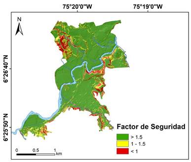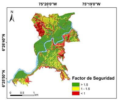 La inestabilidad en el método seudoestático señala un control de la geometría de la ladera, específicamente por la pendiente. En condiciones saturadas se enmarca en las altas pendientes como en algunas márgenes de las quebradas y en los lomos que generan las rocas en la parte baja. Las zonas de baja pendiente se encuentran en amenaza baja con valores de FS mayores a 1,5. En condiciones secas del terreno, las celdas con FS menores a 1 son muy pocas y se restringen a las áreas de mayor pendiente. Las celdas estables (FS<1,5) dominan el área, mientras que las zonas en amenaza media, como en condiciones saturadas, se concentran en las márgenes de las quebradas y en las pendientes moderadas asociadas a los lomos.
