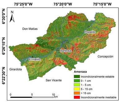 De acuerdo con Jibson [39] y Keefer [3], los sismos con ML>4,0 tienen la capacidad de generar movimientos en masa, tipo caídas y deslizamientos en laderas susceptibles; mientras que sismos con ML>6,0 tienen la capacidad de generar movimientos en masa sobre extensas áreas, tipo caídas y deslizamientos profundos principalmente. De acuerdo con la sismicidad histórica registrada en el Valle de Aburrá y los estudios de microzonificación sísmica del mismo, sismos con magnitudes intermedias han afectado el Valle de Aburrá, y es probable la ocurrencia de sismos de mayor magnitud con consecuencias considerables, como resultado de la acelerada ocupación de las laderas del Valle durante las últimas décadas [18]. Para el municipio de Barbosa, los estudios de microzonificación sísmica señalan sismofuentes a distancias entre 2,5 km y 72 km con magnitudes entre 6,8 y 7,7 y valores de PGA de 0,73 y 0,21 respectivamente [18]; esto, de acuerdo con Jibson [39] y Keefer [3], significa la posibilidad de movimientos en masa profundos y enjambres de movimientos.