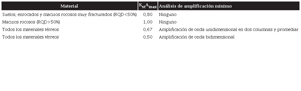A partir de Amax se obtiene el kh con la ecuación (3) teniendo en cuenta los criterios para el análisis seudoestático dados en la tabla de la NSR-10 [50, H.5.2.5]. Para este estudio se adopta el valor 0,8 que representa “Suelos, enrocados y macizos rocosos muy fracturados (RQD1<50%)” (Tabla 2).