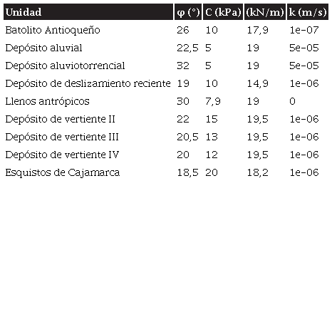 Para la parametrización de las propiedades geomecánicas de los suelos que conforman el área urbana del municipio de Barbosa se utilizó la zonificación geotécnica elaborada en los estudios de microzonificación sísmica para el Valle de Aburrá, donde se realizaron perforaciones y ensayos de laboratorio con correlaciones de ensayos de penetración estándar [7], [18]. Esta zonificación se detalló a partir de información geotécnica suministrada por el municipio de estudios locales de suelos para propósitos constructivos. Para la pendiente se utilizó el modelo digital de elevación con resolución espacial de 2 m elaborado por el Instituto Geográfico Agustín Codazzi (IGAC) en el proyecto CartoAntioquia.