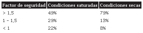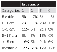 La Tabla 6 presenta los resultados en términos de porcentaje para cada uno de los escenarios evaluados. Clasificado como “inestable” se encuentra el 59% del municipio en los escenarios 1 y 2 y el 17% en los escenarios 3 y 4. Es decir, al pasar de condiciones secas a saturadas, las celdas que se caracterizan por una inestabilidad intrínseca del suelo aumentan 42%. En cambio, dentro de la categoría “estable” se puede ver el contraste entre los efectos de los dos sismos, ya que en condiciones saturadas aumentan estas celdas estables un 14% y en condiciones secas un 43%, al pasar del sismo más fuerte y/o más cercano al más lejano y/o de menor magnitud.
