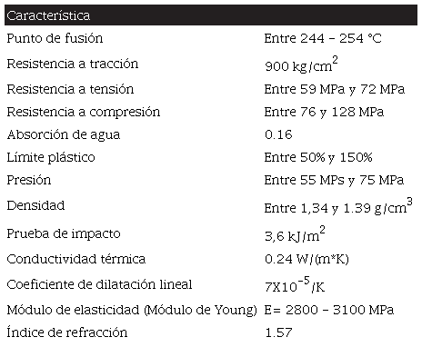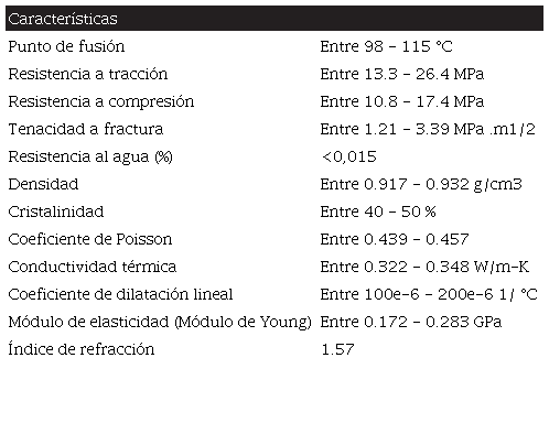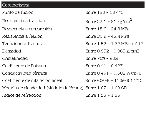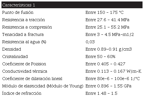 Este material es un termoplástico que “se obtiene mediante la polimerización del propileno o propeno, en presencia de catalizadores en alquil metálico” [47]. Igualmente se puede encontrar en prótesis, componentes para laboratorios, tanques para depósitos de elementos químicos, utensilios de higiene, juguetes, utensilios domésticos, entre otros.