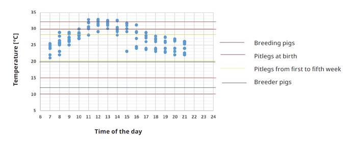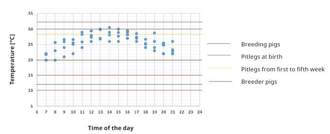 Pigs show maximum performance when housed in comfortable thermal environments; the right environment is at a temperature range in which the thermal regulation processes are minimal [14], [49]-[51]. The variation in the indoor temperature values of pigpens for the time studied (Figs. 1 and 2) requires environmental control measures because it is necessary to thermally adapt the different spaces appropriately to each age of the species concerned [14], [49], [52]. In particular, there is a critical variable for piglets at birth and breeding pigs, especially in lactating sows and their newborn piglets, for which it would be necessary to adapt the space so that lactating piglets are exposed to high temperatures and adult sows to cold temperatures [14], [49], [52].