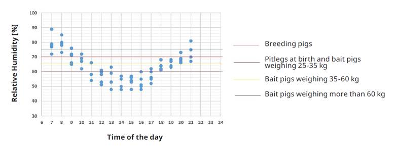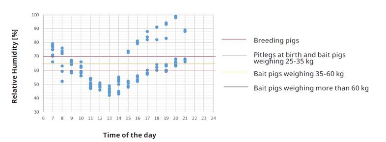 Fig. 3 shows the behavior of RH inside Pigpen no. 1. High RH was observed in the first and last hours of measurement, with values of 80% on average and 60-70 % at 9:00-10:00 and 18:00-19:00 hours. At intermediate hours (11:00-17:00), we noticed a significant decrease in RH with values between 50-60%. Concerning the ages of the species, for all cases, the records on the figure suggest that in the time ranges between 7:00-8:00 and 11:00-17:00 hours, the RH range is not suitable for the species and has extreme variations (high RH in the first time range, low RH in the second time range).