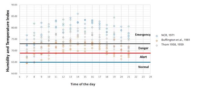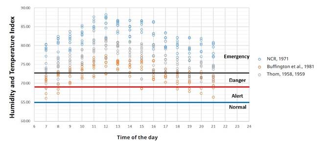 A joint analysis of the climatic factors recorded (air temperature and RH) and climatic stress indices (HTI and HBGTI) show a consistent behavior, where the critical values of such indices occur for critical temperature conditions. RH (higher temperature and lower RH) was as expressed by [60], who describes how the isolines of thermal stress (evaluated from HTI) correspond to inverse relationships between air temperature and RH.