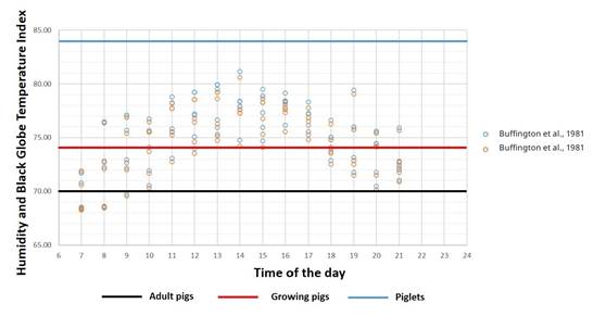 The behavior of climatic variables such as air temperature and RH within two pigpens has been studied. These pigpens are special-use buildings that are located in a hot altitude zone, with which their indoor thermal behavior will be subject to high-temperature values and creates unfavorable conditions in combination with RH values, as occurred in various time ranges. The research verified (data not shown in this document, which are available in [47]) that in the exterior of the pigpens, the temperature conditions are higher; therefore, the pigpens have a thermal resistance response due to its construction configuration, building materials, and ventilation spaces. However, the geographical location still affects the climate inside the pigpens.